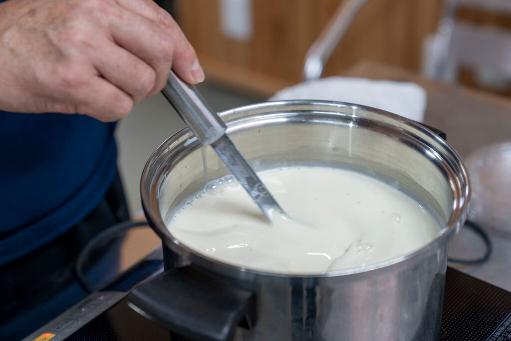 Heating soybeans, straining by hand, and adding natural nigari.